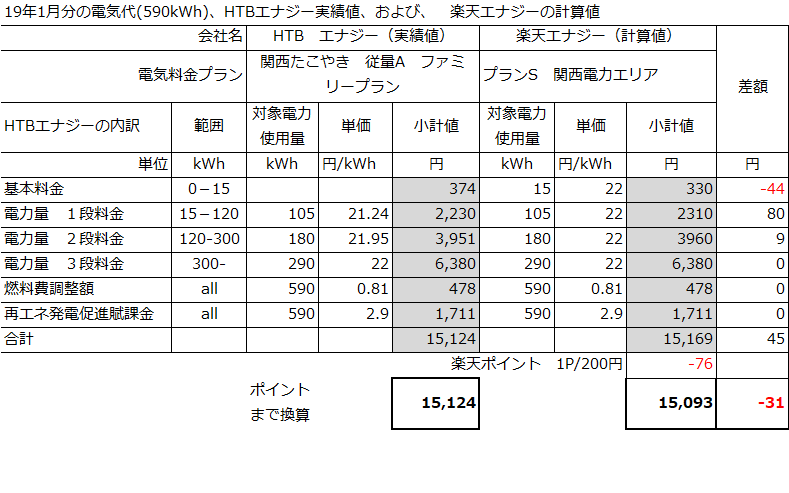 自宅に電気を供給している会社ををみなすことにした。今、HTBエナジーを契約していたが、見直しの結果、結論としては、楽天エナジーにすることになった。コスト的にはほとんど変わらない。楽天エナジーのほうがポイント付与がなければ、1月分:590kWhを利用した場合、45円と若干高いが、結果的、楽天エナジーを申し込むことにした。